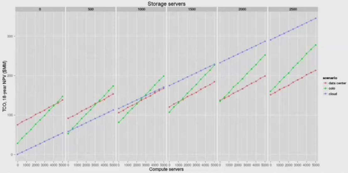 In another example, Michael pumped in a number of compute and storage servers into the TCO model and scaled them both up to see what the model would predict about costs in a private datacenter, in a co-location facility, and a public cloud (presumably Amazon Web Services). Take a look: