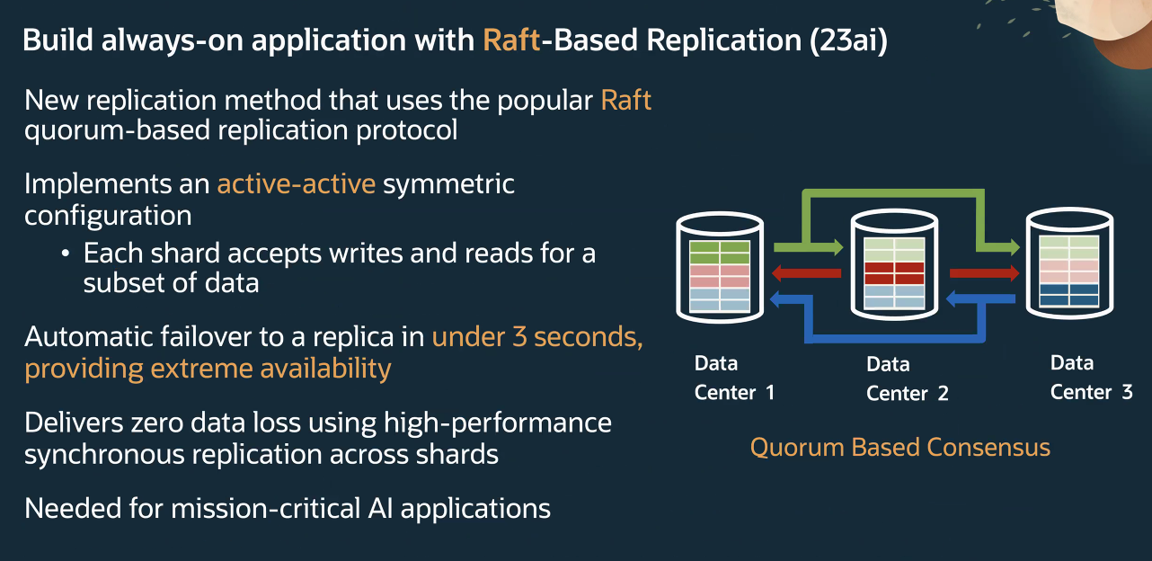 The serverless architecture includes Raft replication that synchronizes data across multiple datacenters to ensure what Oracle calls an “active/active/active” capability to ensure the data is always available, hyperscale-level OLTP so databases can scale to support millions of transactions per second with petabytes of data, capacity than can grow or shrink depending on need, and near-real-time response.