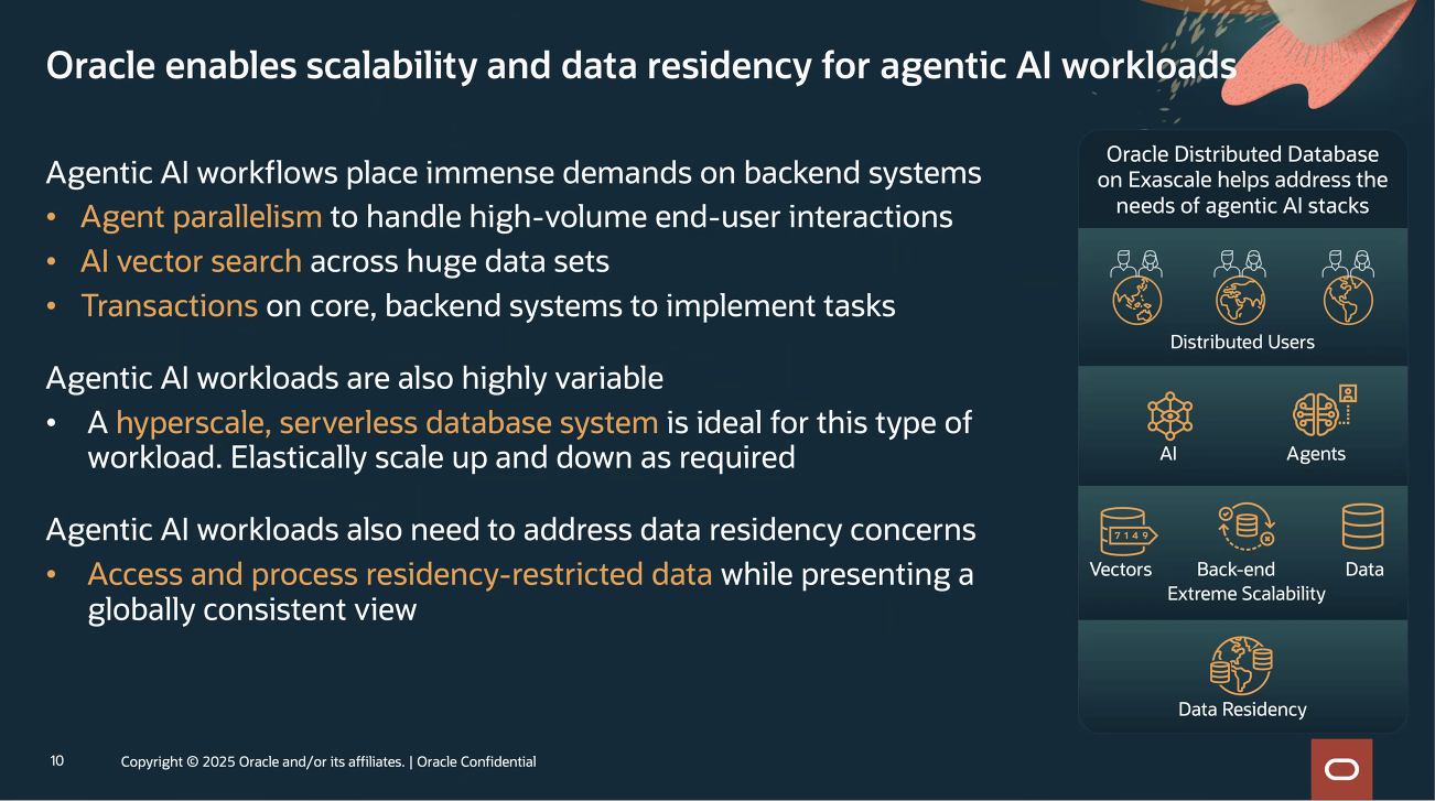 “Agentic AI workloads actually drive demand for these hyperscale systems,” says Hu. “They can place immense demands on backend systems. What’s interesting about agentic AI workloads is that they’re highly variable. When they come, they can hit a very high peak, but then they go away. Then they come again later and so forth. What you want are hyperscale serverless databases that can elastically scale up and down as required, but you don’t want to build for peak capacity and keep it there, because that’s just very expensive. In addition, you need to be able to do AI vector searching across very large datasets. Finally, agentic AI workloads, like anything else, must meet data residency requirements.”