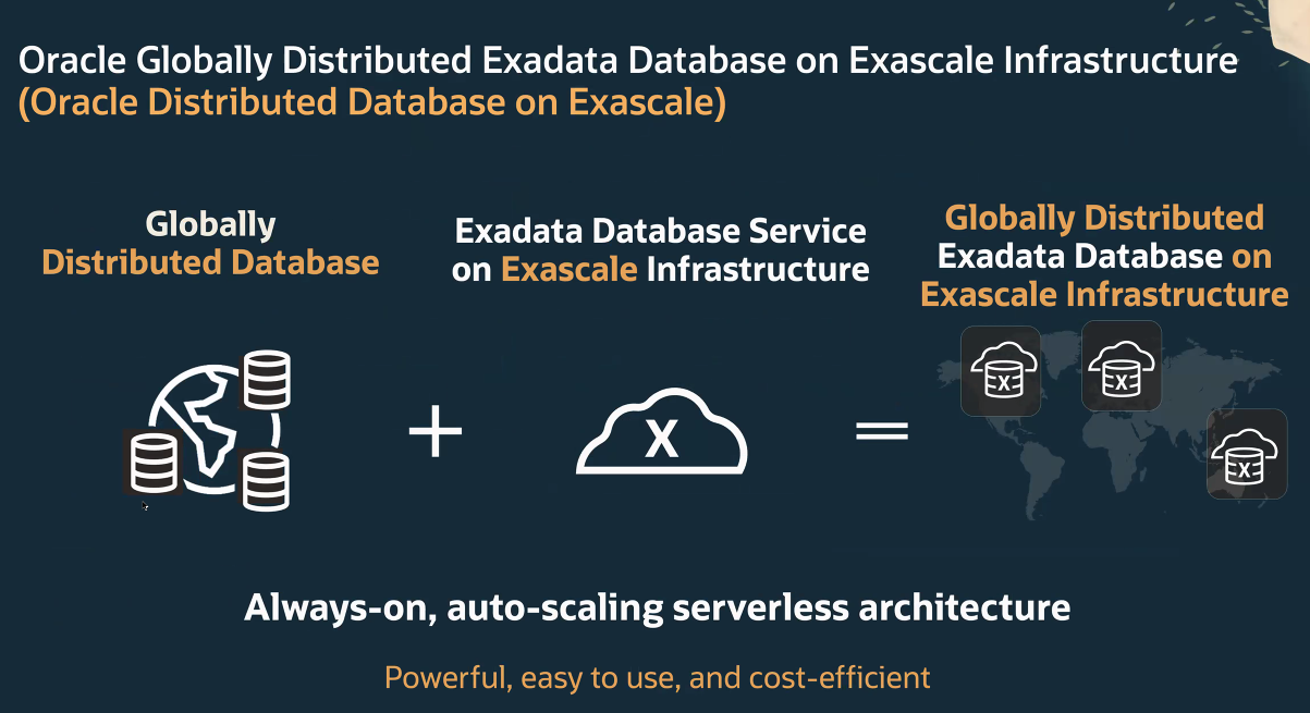 “One is our Global Distributed Database and, secondly, it’s our Exascale infrastructure based on Exadata,” Hu says. “The goal is really to build an always-on, auto-scaling serverless architecture that is powerful, easy to use, and cost-efficient. It’s a distributed database. The distributed database is basically a single database where the data is stored in multiple physical locations. It can be physical servers, it can be in physical datacenters, different regions, different countries.”
