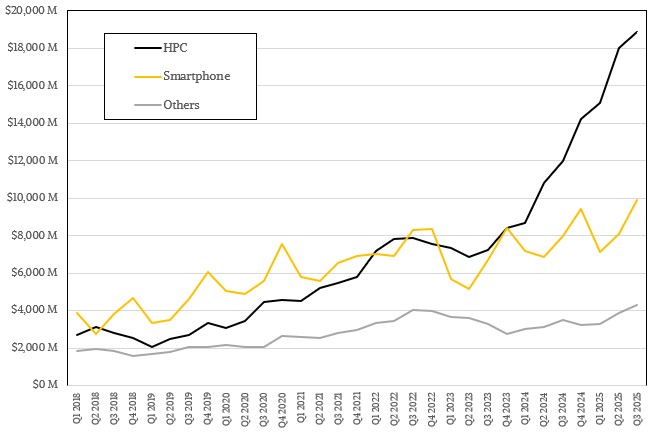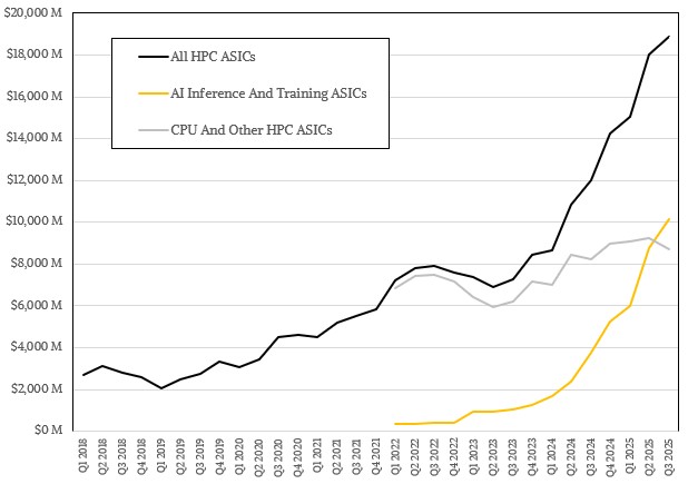In the third quarter of 2025, this HPC category – and again, this is not high performance computing as we talk about it here at The Next Platform – drove $18.87 billion in sales, up 57.4 percent for the year and up 4.6 percent sequentially. Based on our model, AI inference and training chips accounted for 53.9 percent of HPC segment sales for TSMC in Q3 2025 and rose by a factor of 2.7X year on year to $10.16 billion.