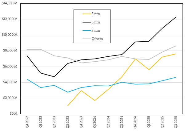Sales of 7 nanometer chips actually grew slower, accounting for $4.63 billion in sales (up 16 percent). Revenues for 5 nanometer chips rose by 62.8 percent to $12.25 billion and represented 37 percent of all chip revenues. Newer 3 nanometer processes rose by 61.9 percent to $7.61 billion and comprised 23 percent of sales.