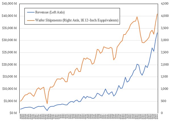The TSMC business is growing in two ways. First, the content of the wafers is getting richer (more features on smaller transistors) and therefore TSMC can charge more money for an etched wafer.