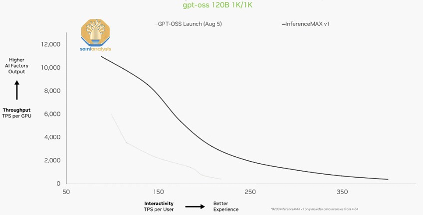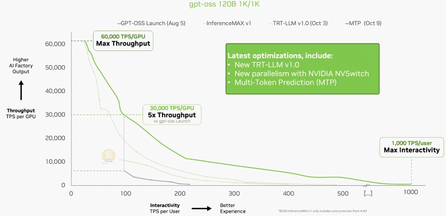 Then less than week later, on October 9, Nvidia added multi-token prediction, a kind of speculative execution for AI models, to the software stack and this changed the shape of the Pareto frontier curve such that Nvidia could push 1,000 TPS per user for the maximum interactivity and could deliver 5X the throughput at around the 100 TPS per user rate set as the peak throughput of the original GPT-OSS benchmark run in August.