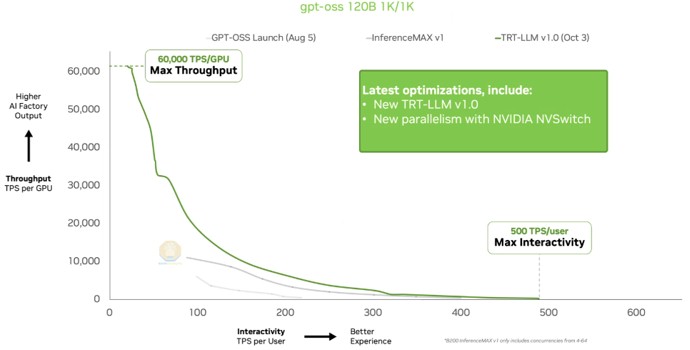 And then on October 3, when Nvidia made some enhancements in the TensorRT inference stack as well as new ways to parallelize data accesses across the NVSwitch memory interconnect in the rackscale system, the Pareto frontier curve was not only pushed out, but the ends of the curve were stretched out closer to the Y and X axes, boosting the maximum throughput for a small number of users to more than 60,000 tokens per second (TPS) per GPU and boosting the maximum user interactivity to nearly 500 TPS per GPU for a high level of interactivity for a small number of users.