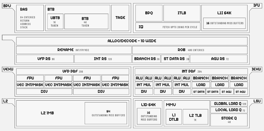 The Arbel core has a 10-wide issue decoder and six ALUs on the integer side and four 128-bit FPUs on the vector side. The core can support 16 scalar instructions in parallel. The core has 64 KB of L1 instruction cache and 64 KB of L1 data cache close to the ALUs and a 1 MB L2 cache close to the FPUs. (Both caches are obviously cross-linked to all the compute elements.) There is a 2 MB cache per core, but again, we don’t know how many cores are on the Arbel chip.