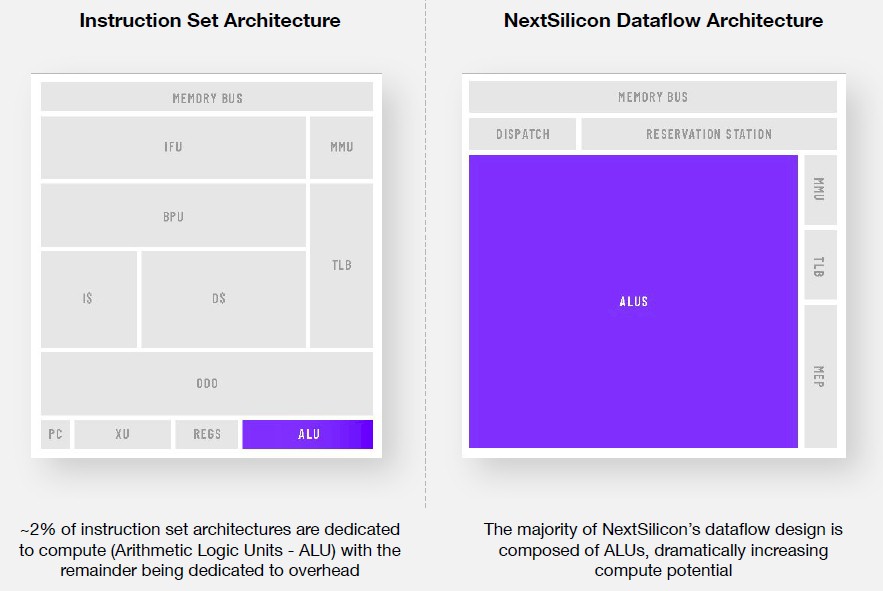 Ilan Tayari, NextSilicon co-founder and vice president of architecture and formerly director of software at Mellanox (now the networking arm of Nvidia), walked through the differences between the Von Neumann architecture of a classical CPU and the new dataflow engine, which quite frankly for the visual thinkers in the crowd makes a lot more sense and is visually pleasing. With a dataflow engine such as NextSilicon has invented, the hardware literally maps itself to the software rather trying to be a short order cook with too many orders but with 27 arms and eyes in the back of the head, flailing around to make up for the difficulties of getting the right data and the right instructions to collide billions of times per second.