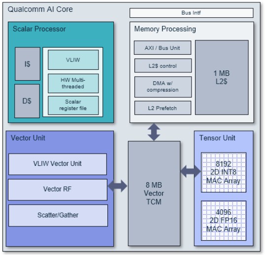 We think that the AI core also has to do at least FP8 if not FP4 precision on the tensor cores, which would double or quadruple the performance per clock cycle compared to the current AI cores based on the Hexagon 6 architecture. It is possible that Qualcomm gets rid of integer support in the tensor core and gooses floating point by a lot. (That’s what we would do.)