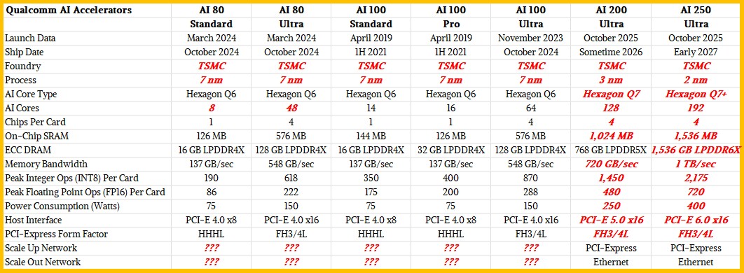 We know that the AI 200 coming sometime next year, with Hussain as the anchor customer, will have 768 GB of LPDDR5 main memory and will use PCI-Express for its scale up network within a rack and Ethernet to scale out across racks. That’s about it. We know that the AI 250 kicker will come in early 2027, and that Qualcomm has committed to an annual cadence for advancements for its AI accelerators.