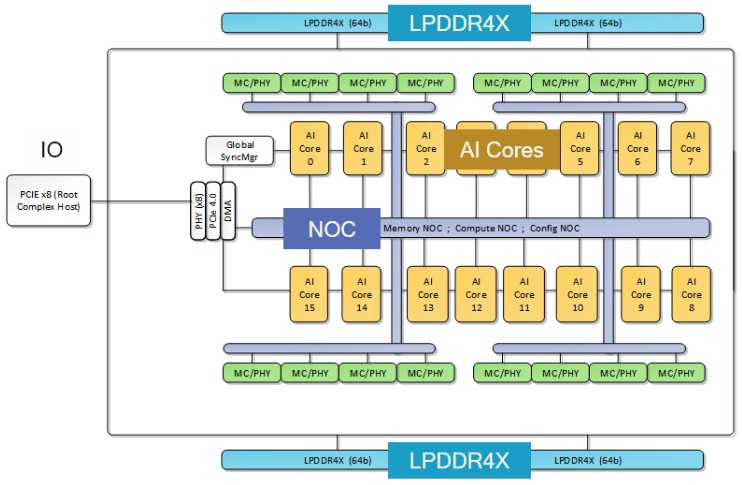 Here is what the AI 100 SoC looks like when you put sixteen of the AI cores on a die and wrap four LPDDR4X memory controllers around it plus a PCI-Express 4.0 controller with eight lanes of I/O to link to a host system: