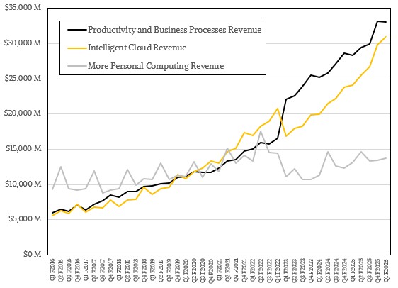 One of the reasons why this is the case is that Microsoft has a vast base of productivity and enterprise application customers as well as the Windows platform on PCs and the Windows Server platform on servers, and now compute and storage capacity rentals on the Azure cloud.