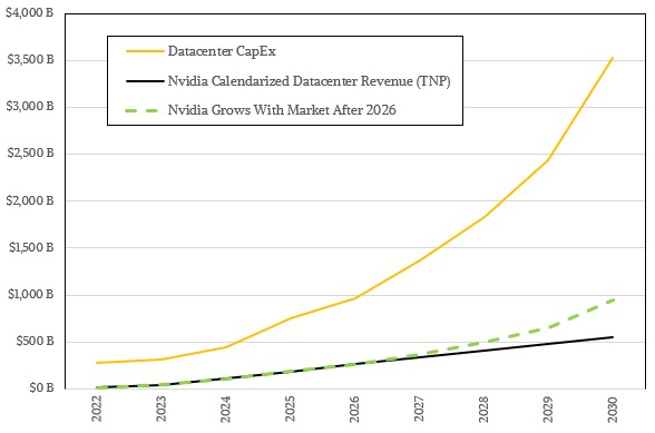 Nvidia’s revenues have been growing faster than the datacenter capex spending on AI for the past several years, and the dashed green line shows what will happen if Nvidia grows as fast as the aggregate global AI capex budget between 2027 and 2030, inclusive.