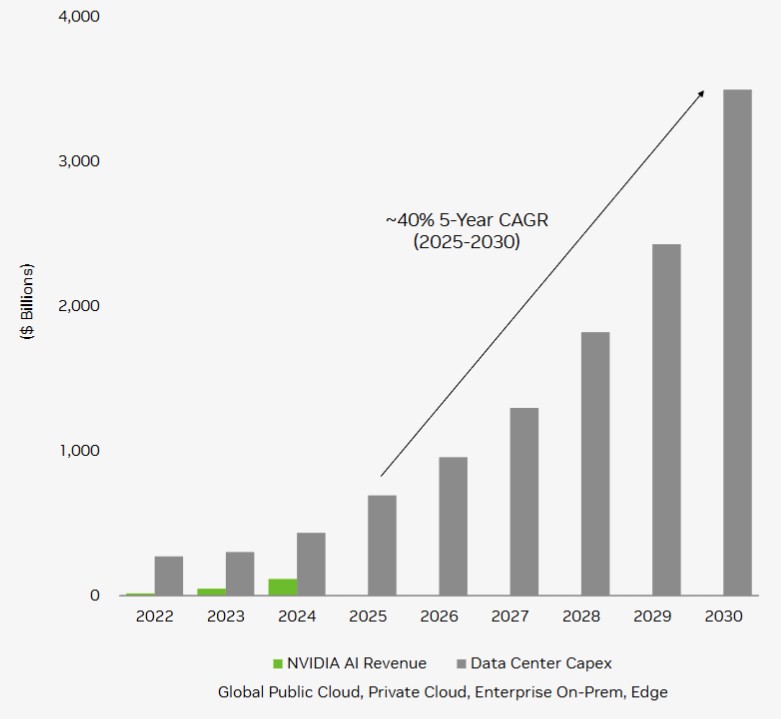 This Nvidia datacenter capex spending forecast at $3.53 trillion is considerably larger than the more than the $1 trillion or so forecast that AMD put out for AI datacenter infrastructure silicon spending last week. AMD is expecting a compound annual growth rate above 40 percent between 2025 and 2023, and Nvidia is talking about “around 40 percent.” So they agree, more or less, on something.