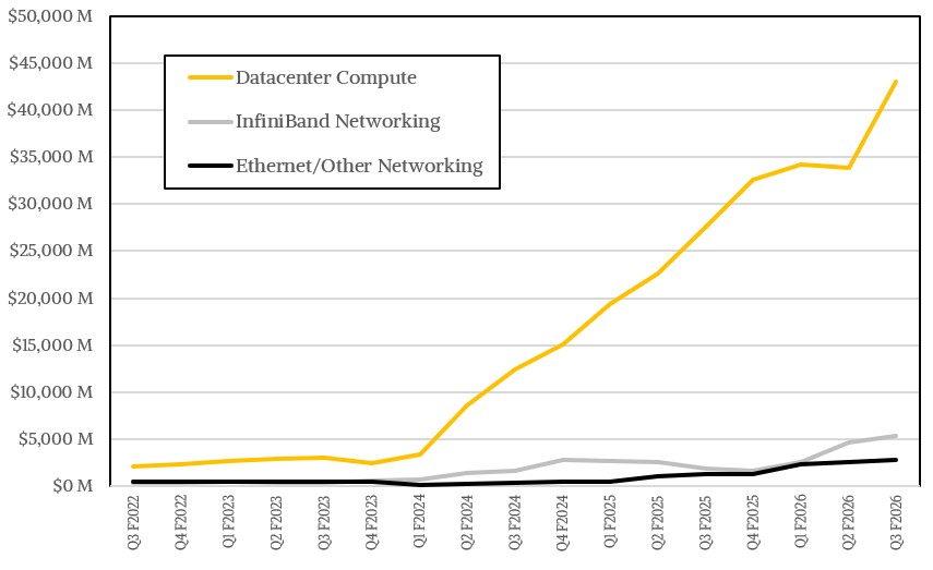 In our model, Nvidia had $43.03 billion in datacenter compute revenues, up 55.7 percent and up 27.1 percent sequentially. This is astounding. But networking is growing even faster as companies build out coherency across racks. We think that InfiniBand revenues were up by a factor of 2.9X to $5.51 billion, and Ethernet and NVSwitch revenues together comprised $3.07 billion in sales, up 2.2X year on year and up 10 percent sequentially. (We have yet to recast the model to separate out Ethernet from NVSwitch, but we are working on it.) Remember: these revenues are not just for ASICs and switches, but also for transceivers and cables, which comprise a big part of the networking bill in the modern datacenter.
