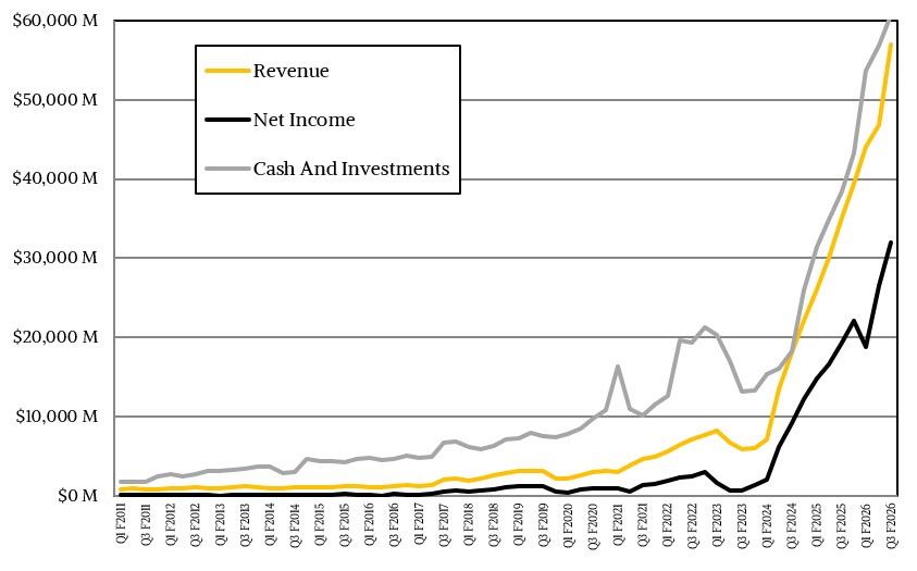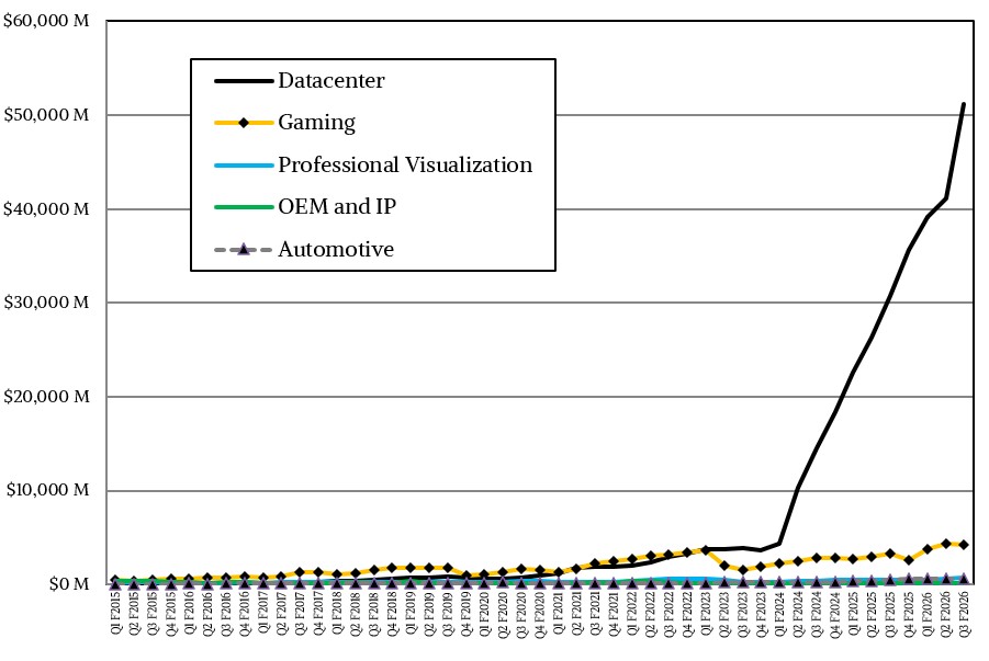 In the quarter ended in October, Nvidia’s overall revenues rose by 62.5 percent to just a tad over $57 billion, and operating income was up by an even larger 64.7 percent to just a tad over $36 billion. Net income was $31.91 billion, up 65.3 percent and working out to an incredible 56 percent of revenues. Nvidia ended the quarter with $60.61 billion in cash and equivalents, which is one reason why Nvidia can be generous with investing in model building and cloud building customers.