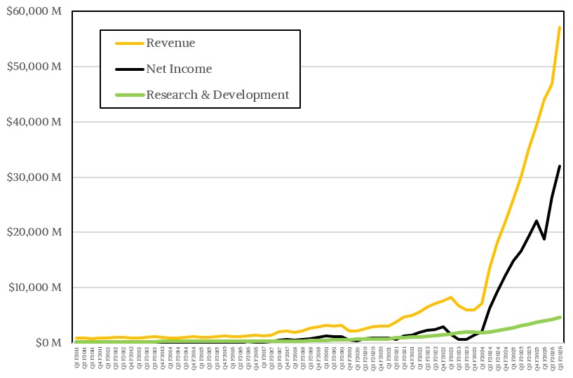 Nvidia can grow slowly and still amass enormous revenues and profits, as our model shows.