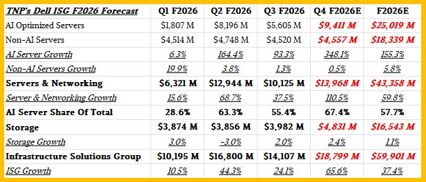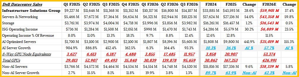 In our model, it looks like Dell will sell around $18.34 billion in non-AI servers for the year, up 5.8 percent compared to fiscal 2025. AI servers will represent 57.7 percent of total server and networking sales in fiscal 2026, which is an amazing shift in a little more than three years, when AI servers was a negligible part of Dell’s datacenter business. That huge AI server business will push Dell’s ISG to nearly $60 billion in sales in fiscal 2026, and there is no reason to believe Dell can’t do even better in fiscal 2027. The company’s top brass is not yet ready to make such prognostications, but will probably start giving some pointers thirteen weeks from now.