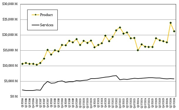In the third quarter of fiscal 2026, which ended in October, Dell sold $21.56 billion in client and datacenter products, up 16.2 percent year on year but down 11.2 percent sequentially. Services revenues were off 5.4 percent to $5.75 billion, which was a 1.6 percent decline from the second quarter of the fiscal year.