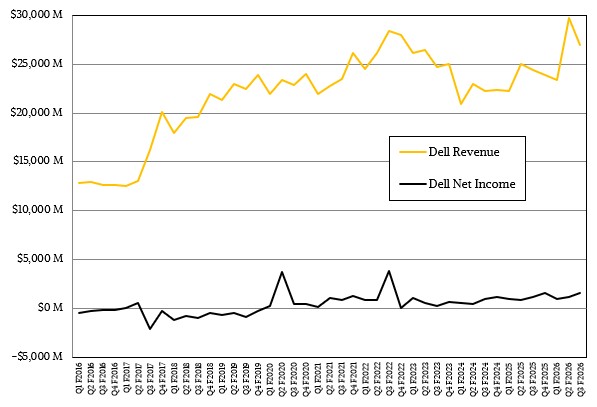 Add it all up and Dell posted a tad over $27 billion in overall sales, up 10.8 percent, with an operating income of $2.12 billion, up a very healthy 27 percent. Net income rose by an even better 37.4 percent to $1.55 billion, which represented 5.7 percent of total revenues. That is quite a bit better than the 4.1 percent average for operating income as a share of revenues that Dell has done since the GenAI boom began at the end of 2022. In that sense, this quarter is a big improvement, and datacenter gear is far more profitable for Dell, even with the AI system dilution of operating income, than its consumer and commercial PC businesses.