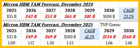 They had better ramp fast if Micron hopes to catch its share of the HBM TAM, which has just skyrocketed. Here is the forecast from last December, followed by the forecast just announced this week: