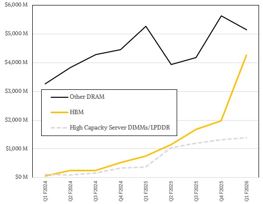 Our model suggests that HBM stacked memory plus high capacity server DRAM plus LPDDR5 low-powered server memory all together accounted for $5.66 billion, or a little more than half of all DRAM memory sold. That is more than a factor of 5X compared to the year ago period, and it is largely due to Nvidia using its HBM and LPDDR5 memory in its AI compute engines.