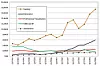 Given a 30 percent growth rate in gaming GPUs in fiscal 2019 and a rate of only 25 percent growth here in fiscal 2020 and fiscal 2021, the gaming division will hit $11.2 billion three years from now. Assuming that the datacenter business will be able to grow at 80 percent a year, then in fiscal 2021, this will be an $11.3 billion business. (Yes, we plugged in numbers just to see what would be needed for them to match.) It could turn out that the markets for GPUs aimed at gaming and at AI/HPC are both saturated, or that they grow more slowly than we think. Assuming that gaming and datacenter both fall off because they are approaching the upper limits of their markets, the future might look like this: