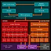 The Zen core has four integer units (ALUs) and two address generation units (AGUs), plus two load/store units and two floating point units. The core can dispatch six micro-ops per clock instead of four with the Excavator core that never made it into a true serve chip, which might have been called the Opteron 6500 had it come out in 2014 or 2015 or so. The bandwidth on the L1 and L2 caches is double that of the L1 and L2 caches on the Excavator cores, and L3 bandwidth was pumped up by a factor of more than 5X. The Zen core has 64 KB of L1 instruction cache and 32 KB of L1 data cache. Each core also has a 512 KB L2 cache that can store either instructions or data, and each core has a port into a 2 MB segment of a unified 8 MB L3 cache. All the caches are linked by 32 byte ports to the L3 cache and all cores can see all elements of the L3 cache with about the same average latency, which means for all intents and purposes it looks like one big L3 cache. This is why the L3 caches are in the inside of the chip, all close to each other, and the cores are all on the outside – a so-called “cores out” layout.