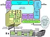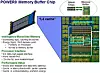 With the Power8 chips that launched in 2014, IBM wanted to get a memory capacity and, perhaps more importantly, memory bandwidth up, so it created an intermediary memory buffer chip, nicknamed “Centaur,” presumably because it was half main memory controller and half L4 cache. Rather than put a straight DDR3 memory controller on the die, IBM created a direct memory interface (DMI) based on SERDES signaling that came off the die and then put the DDR3 or DDR4 interfaces on the Centaur buffer chip, which also had 16 MB of L4 cache. The Power8 chip had eight of these DMI interfaces coming off the die, for a total of 128 MB of L4 cache, supporting four DIMMs per interface and therefore 32 memory sticks per socket. The Centaur interface back into the Power8 chip ran at 9.6 GB/sec (that’s bytes not bits). Here is how the Centaur chip is laid out: