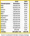 We plugged the numbers in this chart into a table and added them up, and they are larger than the 2021 numbers shown in the forecast above. (Our guess is Counterpoint has revised its server sales for 2021 but forgot to tweak its forecast chart.) This is a bit easier to read: