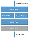 The 800 Gb/sec Ethernet spec adds a new media access control (MAC) and physical coding sublayer (PCS) methods, which takes the existing logic for these functions and tweaks them to allow the distribution of data across eight physical lanes running at a native 106.25 Gb/sec. The spec basically says take two 400 Gb/sec PCS units with the modified FEC to get eight lanes running at an effective 100 Gb/sec to get to 800 Gb/sec per port. Like this, as shown in the high-level block diagram: