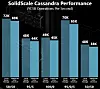Moving the flash out of the servers and into the SolidScale dropped the IOPS on the YCSB tests by between 4 percent and 8 percent, depending on the mix of reads and writes chosen, as you can see. Fisher also told us, as another data point, that in a test storing the databases for Microsoft’s SQL Server running atop a Linux system, a three-node SolidScale array was able to deliver 11.1 GB/sec of bandwidth into and out of the database.