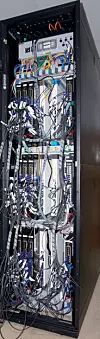 There is no need for network adapters in the prototype since the FPGA itself implements the network router and interface, occupying 40 percent of its programmable logic. FPGA-to-FPGA latency is on the order of 70 nanoseconds, with 155 nanoseconds per hop. Bandwidth is 100 Gb/sec, divided between ten 10 Gbps full duplex links. An optical switch chip was begin developed to enable intra-rack networking, but this component was not completed in time for the final prototype.